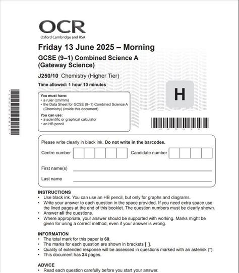 OCR GCSE Combined Science Chemistry A Paper 10 And Mark Scheme J250/10
